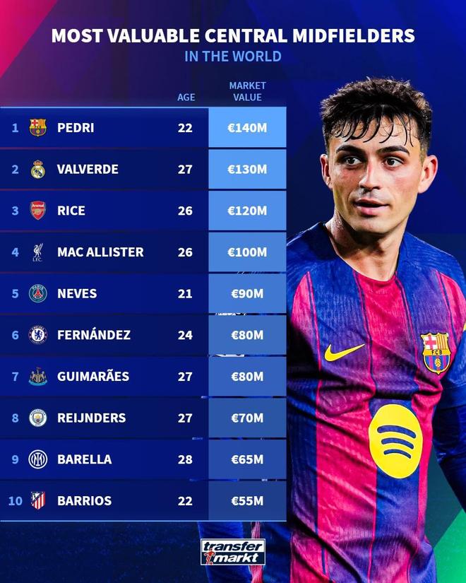 在完成最新一次身价更新后,德国转会市场网站列出了世界足坛中前卫身价榜,佩德里以1.4亿欧居首,巴尔韦德以1.3亿欧排名第二,赖斯以1.2亿欧位列第三。